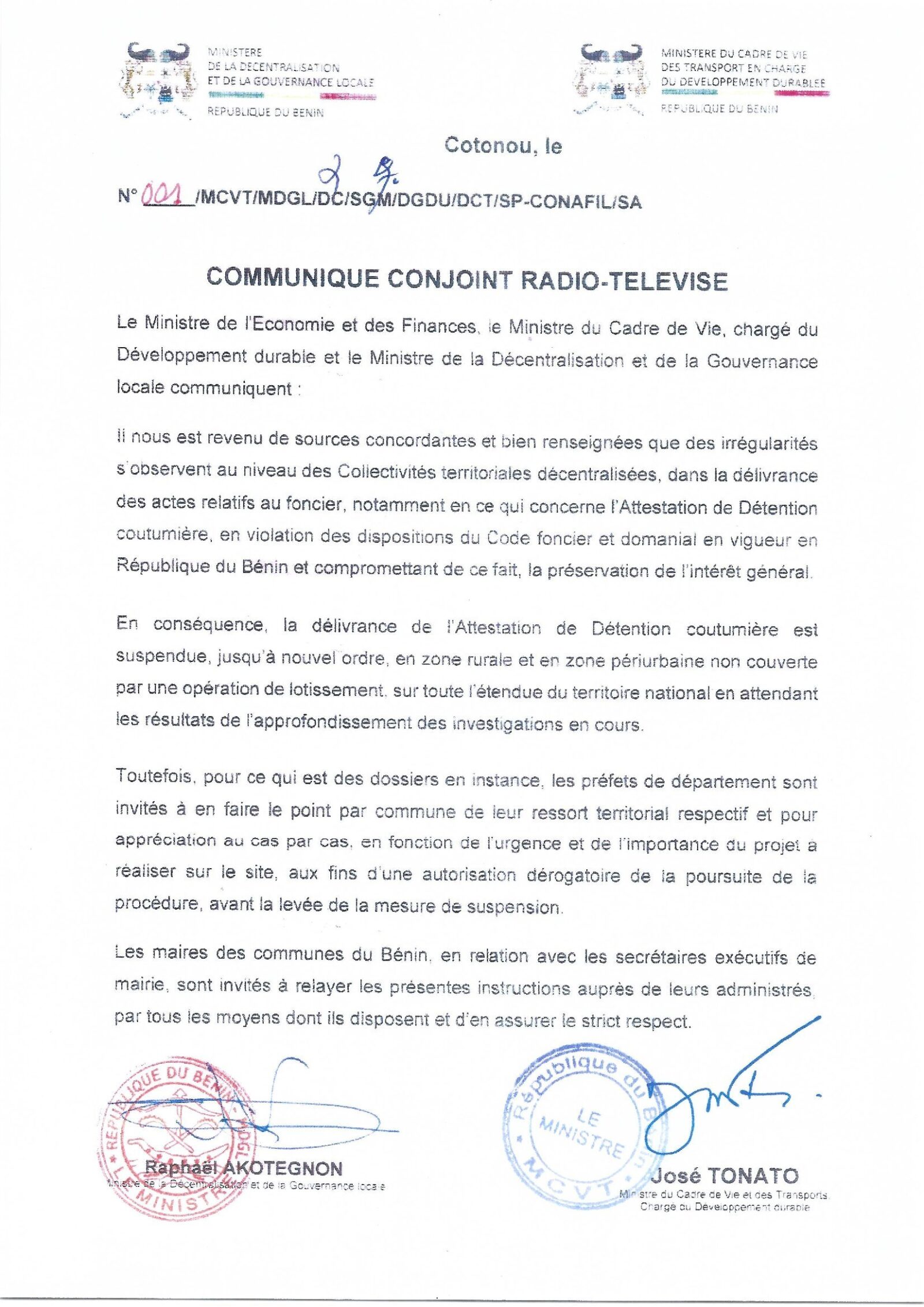 Dans un communiqué radio-télévisé, le gouvernement béninois a suspendu la délivrance de l’Attestation de Détention Coutumière (ADC) dans les zones rurales et périurbaines non couvertes par une opération de lotissement. Cette décision fait suite à une série d’irrégularités notée dans la délivrance des actes délivrés au niveau des collectivités territoriales décentralisées, et ce, en violation des dispositions du Code foncier et domanial en vigueur en République du Bénin. Toute chose qui ne favorise pas la préservation de l’intérêt général.Ainsi, la délivrance de l’acte est suspendue en attendant les résultats des investigations en cours. Il faut noter que la gestion foncière s’est révélée de la « mer à boire » dans les collectivités décentralisées avec des séries de conflits et des disparitions ou vols de terres. Récemment, à l’occasion de la réforme de la décentralisation, le gouvernement a confié cette mission à des cadres d’un certain niveau, des Responsables aux affaires domaniales et environnementales (RADE) accompagnés par des politiques et des comités de gestions. Pourtant, des couacs subsistent toujours, notamment dans les zones non loties. C’est donc ce qui justifie cette décision qui entend remettre les pendules à l’heure et améliorer davantage les pratiques.