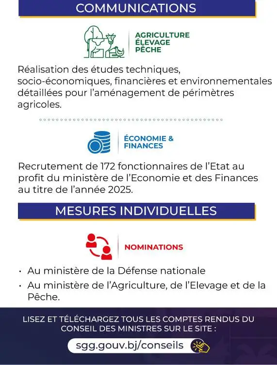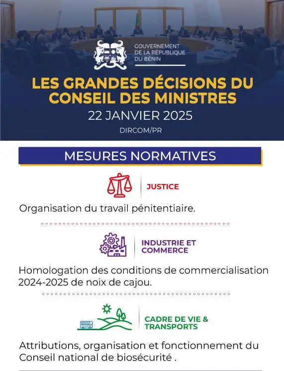 Au Bénin, le gouvernement du président Patrice Talon a dévoilé les grandes décisions prises au terme du conseil ordinaire des ministres de ce mercredi 22 janvier 2025.