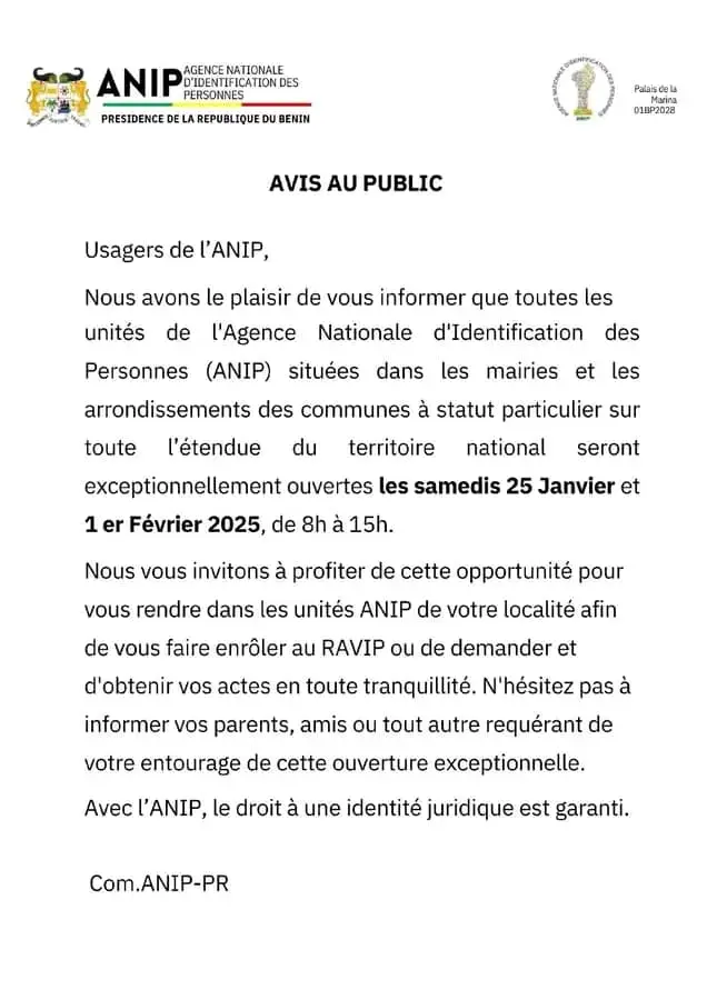 L’Agence Nationale d’Identification des Personnes (ANIP) a annoncé une ouverture exceptionnelle de ses unités les samedis 25 janvier et 1er février 2025.