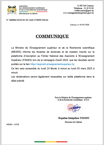 L’annonce a été faite par le ministre de l’Enseignement supérieur et de la Recherche scientifique dans un communiqué officiel. Les résultats seront disponibles sur la plateforme dédiée : https://aspirant.enseignementsuperieur.bj.