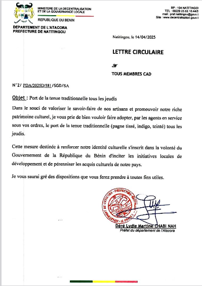 Par une circulaire datée du 14 avril 2025, la préfète de l’Atacora, Déré Lydie Martine Chabi Nah, exige des agents publics du département le port de la tenue traditionnelle tous les jeudis.