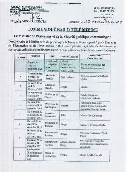 Les pèlerins inscrits pour le Hadj 2026 pourront retirer leurs passeports ordinaires biométriques dans le cadre d’une opération spéciale organisée à partir du 1er décembre 2025, conformément au programme officiel.