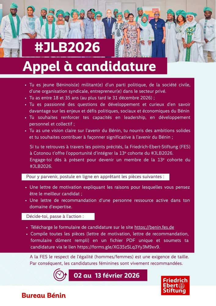 Les candidatures sont ouvertes pour la 13ᵉ cohorte du programme Jeunes Leaders du Bénin 2026. Cette initiative s’adresse aux jeunes béninois de 18 à 35 ans, engagés en politique, dans la société civile, les syndicats ou l’entrepreneuriat, et désireux de renforcer leur leadership et leur compréhension des enjeux nationaux.